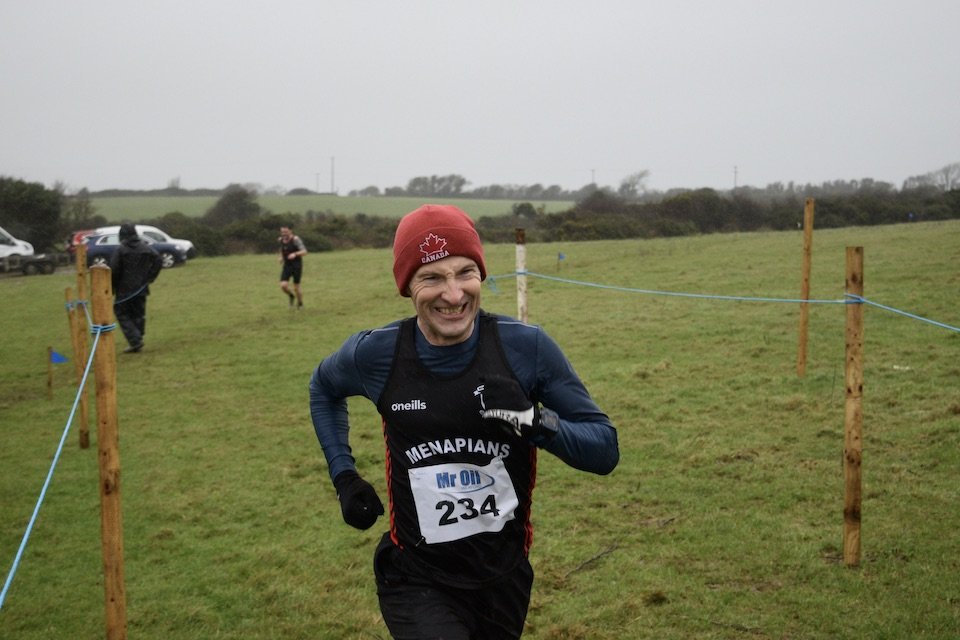 Tony Harpur sprinting for home in Wexford Master Cross Country 2025.