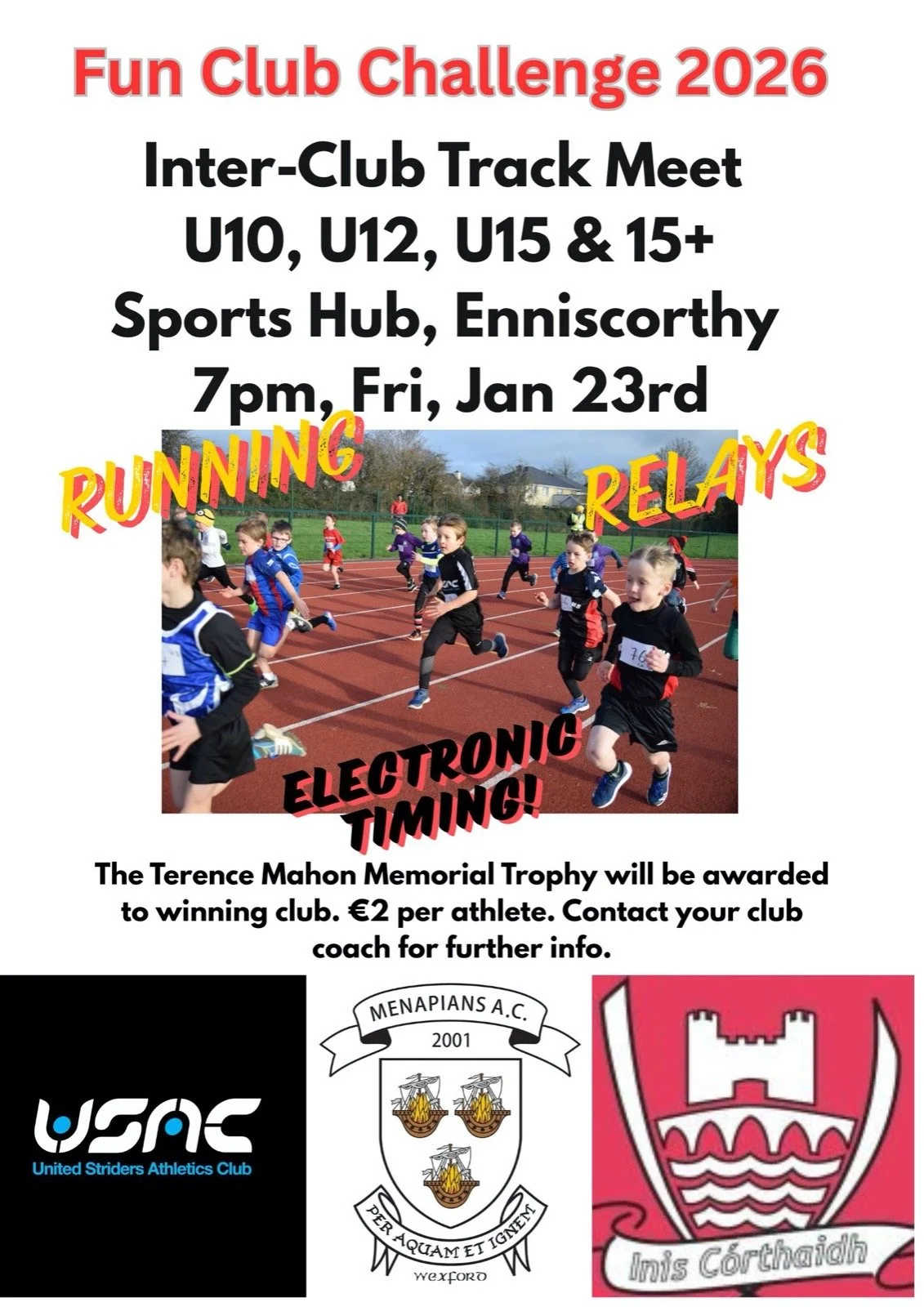 Enniscorthy AC has invited Menapians and United Striders to join them at Enniscorthy Sports Hub for a fun juvenile meet this Friday, June 23 (7pm). The plan is to have a series of 1km time trials / relays for U10, U12, U15 and 15+. As far as we can discern, the idea is that the relay legs are 1km in length with times added together for a club’s top 5 in each age group. The winning club gets to take home the Club challenge annual trophy.